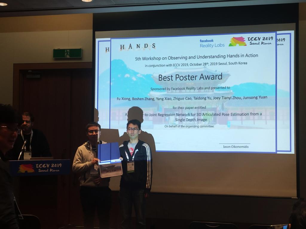 大会组织的“The Hands Challenge on 3D Hand Pose Estimation”全球竞赛结果也于10月28日揭晓,公司硕士生熊拂、张博深、于泰东等同学在肖阳副教授、曹治国教授的指导下,参加了“Depth-Based 3D Hand Pose Estimation”和“Depth-Based 3D Hand Pose Estimation while interacting with Object”两个任务的竞赛,均获得第二名,获得了组委会颁发的亚军获奖证书,其学术报告也被评为该专题Workshop的最佳Poster论文。