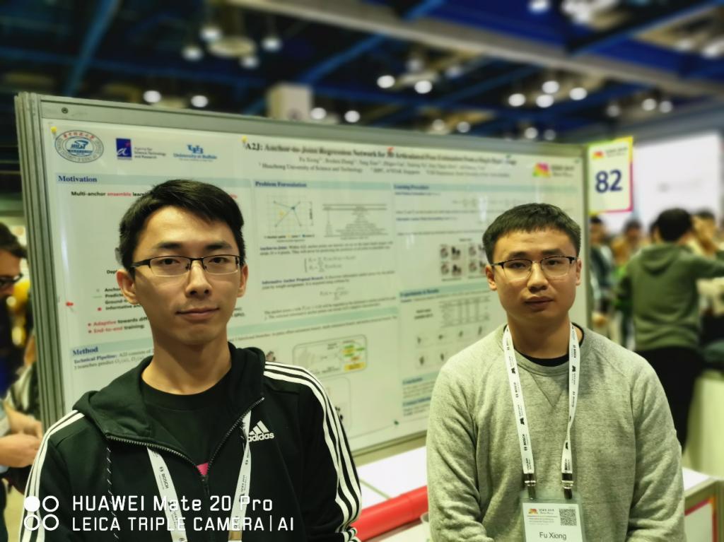研究生熊拂、张博深等同学在肖阳副教授、曹治国教授指导下,发表了“A2J: Anchor-to-Joint Regression Network for 3D Articulated Pose Estimation from a Single Depth Image”论文,该论文在国家自然科学基金青年项目资助下,针对目前学术界基于热图的姿态估计方法和3D CNN等姿态估计方法存在的预测时间长、预处理复杂及泛化能力不足等问题,提出了一种基于锚点的姿态估计方法,通过集成多个锚点的预测值来精确回归3D关节点坐标。该方法具有较强的自适应性,针对不同的关节点,锚点在集成投票时可以通过端到端学习的方式挖掘到特定的特征模式。此外,该方法采用2D CNN的方案,且网络结构中不需要上采样操作,大大降低计算量,最终A2J可以在单张GPU上达到105 fps的运行速度。作者进行了5个深度图公开数据库的对比实验,包括3个手势姿态估计数据库以及2个人体姿态估计数据库,测试结果表明A2J已经达到目前业界最佳的效果,并且实测速度相较于之前的方法具有明显的优势。