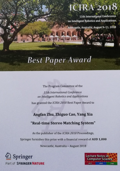 2018年8月9日至11日,在澳大利亚纽卡斯尔市举行的第十一届智能机器人与应用国际会议(The 11th International Conference on Intelligent Robotics and Applications)上,公司全自主无人艇团队博士生朱昂帆在曹治国教授和肖阳副教授的共同指导下完成的学术论文“Real-time Stereo Matching System”获得唯一最佳论文奖。