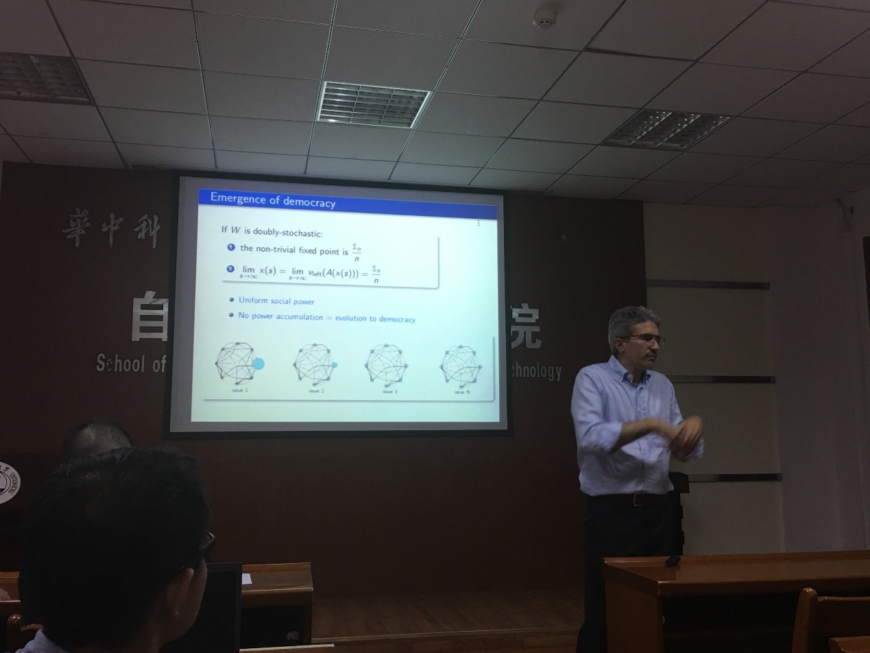 7月27日下午,加州大学圣塔芭芭拉分校Francesco Bullo教授应邀来公司进行学术交流,并做了题为“On the Dynamics of Opinions and Influence Systems ”的学术报告。报告会由张海涛教授主持,袁烨教授,卢森堡大学Jorge教授等30多位师生参加了报告会。