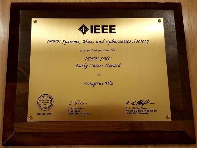 在2017年10月5至8日于加拿大Banff举行的 IEEE International Conference on Systems, Man and Cybernetics (SMC)上,公司自动化公司青年伍冬睿教授因在计算智能和脑机接口方面的研究取得突出进展,获得“IEEE SMC Early Career Award.”成为该奖首位获奖人,也是2017年度的唯一获奖者。该奖项2014年由IEEE SMC协会设立,旨在奖励35岁以下,在系统科学和工程、人机交互系统和控制论的理论和应用方面做出突出贡献的青年学者,每年全球授予1-2人,因评选要求严格,该奖项获奖者在2014至2016年间空缺。