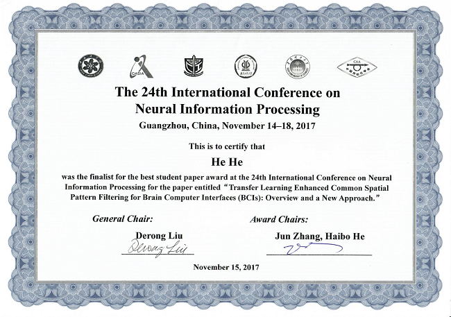 在2017年11月14-18日于广州召开的第24届International Conference on Neural Information Processing (ICONIP)上,伍冬睿教授与其博士生何赫共同完成的论文“Transfer Learning Enhanced Common Spatial Pattern Filtering for Brain Computer Interfaces (BCIs): Overview and a New Approach”入围会议最佳员工论文奖(Best Student Paper Award Finalist)。该文章提出了一种融合迁移学习和共同空间模式滤波器的新方法,能有效提高脑机接口系统在校准数据不足时的准确度。